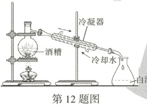 12. 跨学科·化学蒸馏法在酿酒过程中得到广泛应用。如图所示是蒸馏的原理图,烧瓶内装有含酒精和水的酒糟,在蒸馏的过程中,下列说法正确的是(