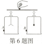 6. 回归教材·人教九物全P44图15.2-1改编如图所示,取两个相同的验电器A、B,使验电器A带正电、验电器B不带电,可以观察到验电器A的金属箔张开。用一个带绝缘柄的金属棒把验电器A、B连接起来,观察到验电器B的金属箔张开,实验中金属棒与金属球接触的瞬间,金属棒中电子的方向为_(选填“从A到B”或“从B到A”)。