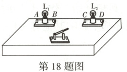 18. 物理课上,老师给同学们展示了一个有盖的木盒,盒盖上可看到两个小灯泡和一个开关(导线的连接情况隐藏在盒内),如图所示。当老师闭合开关时,两个小灯泡都亮了;断开开关,两个小灯泡又同时熄灭。