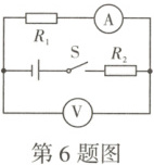 6. 如图所示,电源电压保持不变,电阻 $ R_2 = 10 \Omega $,闭合开关 S,电流表的示数为 0.2 A,电压表的示数为 1 V,则电源电压为