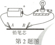 2. 如图所示,用 A、B 两个金属夹子将一根铅笔芯接入电路中,当 B 夹子左右移动时,小灯泡的亮度会发生变化。导致铅笔芯接入电路的电阻发生变化的主要因素是
