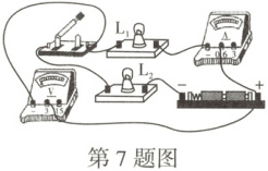 7. 如图所示,电源电压为 3 V,电压表的示数为 1.8 V,电流表的示数为 0.2 A,则此时小灯泡 $ L_2 $ 的灯丝电阻为