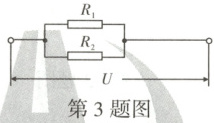 3. 如图所示,电阻 $ R_1 = 4 \Omega $,电阻 $ R_2 = 6 \Omega $,把它们并联在 $ U = 3 $ V 的电路中,则电阻 $ R_1 $ 和 $ R_2 $ 并联后的总电阻为