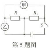 5. 如图所示,电源电压为 5 V,电阻 $ R_1 = 5 \Omega $,电阻 $ R_2 = 10 \Omega $,当闭合开关 S 后,两电表有示数且保持稳定,则甲电表的示数为