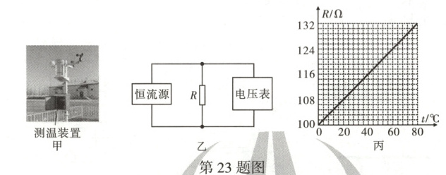 23. 跨学科实践·物理学与工程实践如图甲所示是自动气象站中的测温装置,它的测温电路的简化图如图乙所示,其中的“恒流源”是一个电压可变、输出电流恒定的电源,当电阻 R 的阻值随温度变化时,通过电阻 R 的电流保持 0.2 A 不变。电阻 R 的阻值随温度的变化关系如图丙所示,通过电压表的示数可反映环境的温度。求: