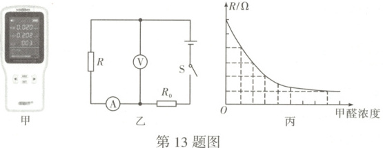 13. 如图甲所示的家用甲醛检测仪具有多项数据检测性能。小江画出了这个仪器的模拟电路图,如图乙所示,电源电压保持不变,$R_{0}$为定值电阻,R为气敏电阻,其阻值随甲醛浓度变化的曲线如图丙所示。下列说法正确的是 (