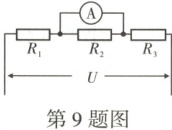 9. 三个电阻值均为10Ω的电阻$R_{1}$、$R_{2}$、$R_{3}$串联后接在电压恒定为U的电路中。某同学误将一只电流表并联在电阻$R_{2}$两端,如图所示,发现电流表的示数为1.5A,据此可知电源电压U为