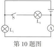 10.不变 [解析]由电路图可知,开关S闭合时,电流从正极出发分两支,一支经小灯泡$L_{1}$、电流表;另一支经开关S、小灯泡$L_{2}$,然后共同回负极,由此可知,小灯泡$L_{1}$和$L_{2}$是并联的;断开开关S,电路为小灯泡$L_{1}$的简单电路,根据欧姆定律$I=\frac{U}{R}$,小灯泡$L_{1}$两端的电压不变,电阻不变,电流表仍然测小灯泡$L_{1}$的电流,故电流表的示数不变。