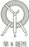 8. 回归教材·人教九物全P84图16.4-5改编如图所示是旋转式变阻器的结构图,a、b、c为变阻器的三个接线柱,d为旋钮触片。将该变阻器接入电路中调节灯泡的亮度,要求顺时针旋转旋钮触片时,灯光变亮,则应连接接线柱