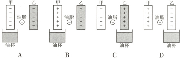 12. 核心素养·科学态度与责任抽油烟机可以有效减少油烟对空气的污染。静电分离技术可让金属板甲、乙和油脂液滴分别带上电荷。当油烟上升时,带电的油脂液滴会被一侧的金属板吸附,并流入下方的油杯。关于金属板所带电荷及油杯的位置,下列符合要求的是 (