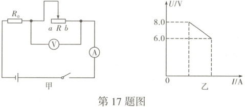 17. 如图甲所示,电源电压保持不变,定值电阻$R_{0}$的阻值为10Ω。在滑动变阻器R的滑片从a端移动到中点的过程中,电压表的示数U与电流表的示数I的关系图像如图乙所示。下列说法正确的是 (