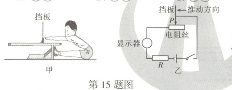15.B [解析]①由电路图可知,显示器与电阻丝串联,故显示器应为电流表,故①错误;②柔韧性较好的同学测量时,电阻丝接入电路中的长度较短,电阻丝接入电路的电阻较小,电路电流较大,故②错误;③柔韧性水平低的同学测量时,电阻丝接入电路中的长度较长,电阻丝接入电路的电阻较大,电路电流较小,故③正确;④当电阻丝接入电路的电阻为0时,电阻R能起到保护电路的作用,避免电路发生短路,故④正确。
