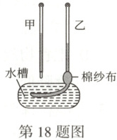 18. 核心素养·科学探究湿度对物质蒸发快慢也有影响,湿度越大,水蒸发越慢。有一种能反映空气中水蒸气含量(空气湿度)的装置,如图所示,它是由甲、乙两支相同的温度计并列组成的,温度计甲是干燥的,温度计乙的玻璃泡上包着湿棉纱布,两支温度计的示数差就反映了空气的湿度。