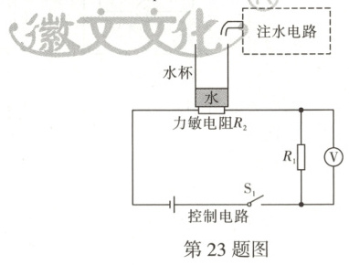 23. 跨学科实践小组设计了一个可自动注水的茶吧机电路,原理简化图如图所示。控制电路中电源电压保持不变,$R_{1}$为定值电阻,$R_{2}$为力敏电阻。平底薄壁直筒状水杯放在装有力敏电阻$R_{2}$的平板上,平板受到的压力F随杯中水深h变化的关系满足F=2N+20N/m×h,力敏电阻$R_{2}$的阻值随压力F变化的部分数据如表所示。定值电阻$R_{1}$两端的电压变化能自动控制注水电路的通断。当空水杯放在平板上时,定值电阻$R_{1}$两端的电压为9V,此时恰好触发注水电路启动注水;当水深h=0.15m时,定值电阻$R_{1}$两端的电压为12V,此时恰好断开注水电路停止注水。求: