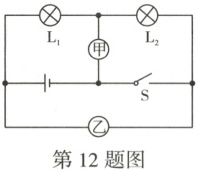 12. 核心素养·物理观念如图所示,电源电压保持不变。闭合开关 S 后,小灯泡 L₁、L₂ 都能正常发光,甲、乙两个电表的示数之比为 3:5,则小灯泡 L₁、L₂ 的额定功率之比是(