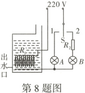 8. 如图所示是饮水机的工作原理电路图,其中 S 是一个温控开关,R₁ 为电加热管,A、B 是同型号不同颜色的指示灯。先让开关 S 与 1 接触,再让开关 S 与 2 接触,此时 R₁ 的电功率变