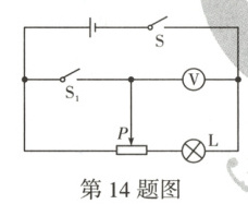 14.A 【解析】A、B.闭合开关$S$、$S_{1}$,滑动变阻器的滑片$P$的左边部分短路,右边部分和小灯泡$L$串联,电压表测电源电压,滑动变阻器的滑片$P$向右移动时,电路总电阻变小,由欧姆定律可知,电路中的电流变大,小灯泡$L$的亮度变亮,电压表的示数不变,故A正确、B错误;