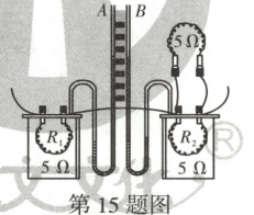 15.D 【解析】由图可知,电阻$R_{1}$的阻值为$5\ \Omega$;电阻$R_{2}$的阻值为$5\ \Omega$;电阻$R_{2}$与右上的电阻并联,电阻$R_{1}$和它们串联,所以,$I_{1}$为干路电流,$I_{2}$为支路电流,且$2I_{2} = I_{1}$,根据焦耳定律$Q = I^{2}Rt$,左右两边浸入密封空气部分的电阻$R$相等,但右边电流只有左边的一半,故左侧产生热量较多,根据空气热胀冷缩,$A$管液面升得较高。