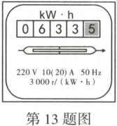 13.C 【解析】A.由电能表的表盘可知,该电能表的标定电流为$10\ A$,最大工作电流为$20\ A$,故A错误;