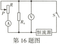 16.C 【解析】由图可知,滑动变阻器$R$与定值电阻$R_{0}$并联,电压表测电源电压,电流表测通过滑动变阻器$R$的电流。设电源提供的电流恒为$I_{总}$,电源电压为$U$。