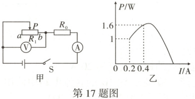17. 跨学科·数学如图甲所示,R₀ 为定值电阻,R₁ 为滑动变阻器。当滑动变阻器 R₁ 的滑片 P 移动时,滑动变阻器 R₁ 消耗的电功率与电流关系的图像如图乙所示。下列说法错误的是(
