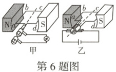 6.甲 【解析】图甲中没有电源,只有磁体和线圈,是发电机的示意图;图乙中有电源,是电动机的示意图。