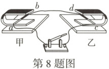 8. 回归教材·沪科九物全P161T5改编如图所示,将甲、乙两个装置中可在各自轨道上自由滑动的金属杆ab和cd用导线连接起来,闭合开关后,将装置甲中的金属杆ab水平向右移动时,乙装置中的金属杆cd也随之向右运动。若让金属杆ab水平向左移动时,则金属杆cd会向_(选填“左”或“右”)运动。