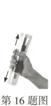 16. 跨学科实践·物理学与社会发展如图所示是一种手摇发电手电筒,当沿图中箭头方向来回摇动手电筒时,灯泡就能发光。手电筒的壳体透明,可以清晰地看到里面有线圈,摇动时感觉到有一个物体在来回运动。下列说法正确的是(