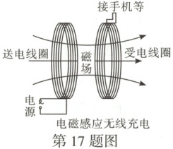 17.D 【解析】①将电源换成干电池,无法产生大小和方向都发生变化的电流,因此无法实现手机无线充电,故①错误;②受电线圈感应到电磁信号,产生感应电流给手机电池充电,这是电磁感应现象,即受电线圈是利用电磁感应原理产生感应电流的,电动机不是利用该原理工作的,故②错误;③受电线圈由于电磁感应产生大小和方向都发生变化的感应电流,是交流电,故③正确;④手机充电的过程中,消耗了电能,将电能转化为化学能,故④正确。