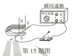 15.B 【解析】A.根据实验器材可知,无法改变磁场强弱、电流大小,所以无法探究影响通电导线受到的磁场力大小的因素,故A错误;B.由图可知,电路中有电源、磁体、开关、导体棒ab,闭合开关后,通电导体棒ab在磁场中会受到磁场力的作用而运动;实验中可以改变电流方向、磁场方向(调换电源正负极或磁极),可以探究影响通电导线受到的磁场力方向的因素,故B正确;C、D.该实验与电磁感应现象无关;由于无法改变电流大小,也不能检测磁场的强弱,所以不能探究影响通电导线周围产生的磁场强弱的因素,故C、D错误。