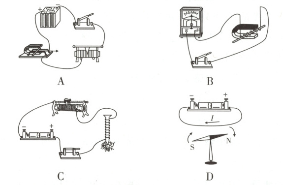 14.A 【解析】直流电动机是有轨电车的动力心脏,其工作原理是利用通电线圈在磁场中受力而转动制成的。A.由A图可知,通电导体在磁场中受力而运动,故A符合题意;B.由B图可知,闭合电路的一部分导体在磁场中做切割磁感线运动,会产生感应电流,这是电磁感应现象,发电机是根据这个原理制成的,故B不符合题意;C.由C图可知,该电路图是探究影响电磁铁磁性强弱的因素,故C不符合题意;D.由D图可知,探究的是电流的磁现象,即通电导体周围存在磁场,故D不符合题意。