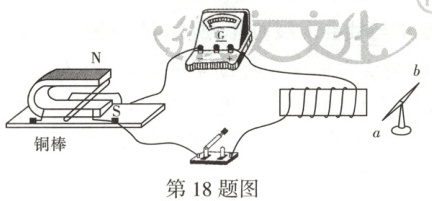 18. 核心素养·物理观念某物理兴趣小组进行“电与磁的关系”的实验探究,在水平桌面上按照如图所示装置进行实验,闭合开关,使铜棒在水平金属轨道上快速左右运动,观察到灵敏电流计的指针发生偏转。