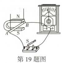 19. 回归教材·北师九物全P171学生实验改编如图所示是“探究什么情况下磁可以生电”的实验装置,用棉线将一段导体AB悬挂起来,放置于蹄形磁体的磁场中,再用导线把导体AB和灵敏电流计连接起来,组成了闭合电路。