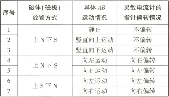 (2)观察到的现象如表所示,由此可知,闭合电路的一部分导体在磁场中做切割磁感线运动时,电路中会产生感应电流。