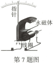 7. 如图所示是学用电流表的内部结构示意图。当电流表接入电路,有电流通过线圈时,线圈带动指针偏转。根据我们所学的知识判断,该电流表的工作原理与