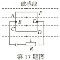 17. 如图所示,将矩形铜线框ACDF上的B、E两点接入电路并放入磁场中,线框的AB、BC、DE和EF段都受到磁场的作用力,下列两段线框在磁场中受力的方向相同的是(