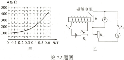 (2)磁敏电阻R的阻值R₁=$\frac{U₁}{I₁}$=$\frac{6V}{0.04A}$=150Ω,由图甲可知,此时的磁感应强度为0.3T。(3分)