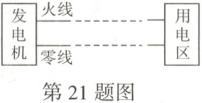 21. 如图所示是某医院的应急供电线路示意图。柴油发电机的输出电压为260V。用电区内每个用电器的额定电压均为220V,总功率为44kW,当这些用电器都正常工作时,求: