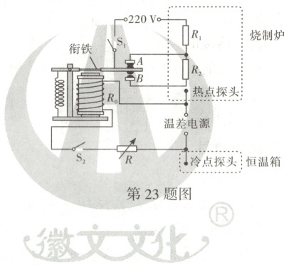 23. 跨学科·数学学校为陶器烧制炉加装了一个自制的可控制温度的装置,其简化的工作电路如图所示,R₁、R₂是烧制炉内的加热电阻,电阻R₁=44Ω,R是滑动变阻器,R₀是电磁铁线圈的电阻。温差电源的热点探头放在烧制炉内,冷点探头放在20℃的恒温箱中。烧制炉接入220V的电路中,闭合开关S₁、S₂,衔铁与触点A接触,烧制炉处于加热状态。当电磁铁线圈中的电流达到0.01A时,衔铁被吸下与触点B接触,烧制炉进入保温状态,保温功率为200W。测试时,第一次调节滑动变阻器R的阻值为1Ω,当烧制炉刚进入保温状态时,测得烧制炉内的温度t₁=400℃;第二次调节滑动变阻器R的阻值为4Ω,当烧制炉刚进入保温状态时,测得炉内的温度t₂=1000℃。
