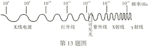 13.C 【解析】A.任何一种光波都是电磁波,故A正确,不符合题意; B.由图可以看出红外线比紫外线的频率低,故B正确,不符合题意; C.真空中不同电磁波的传播速度相同,故C错误,符合题意; D.由于电磁波传播速度不变,则电磁波的频率越高,波长越短,故D正确,不符合题意。