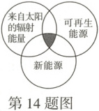 14.B 【解析】能归入图中阴影部分的能源应该是来自太阳的热辐射,并且是可再生能源和新能源。 A.煤炭不是可再生能源也不是新能源,沼气不是来自太阳的辐射能源,故A不符合题意; B.太阳能、风能是来自太阳的热辐射,并且是可再生能源和新能源,故B符合题意; C.天然气是不可再生能源,故C不符合题意; D.石油是不可再生能源,故D不符合题意。