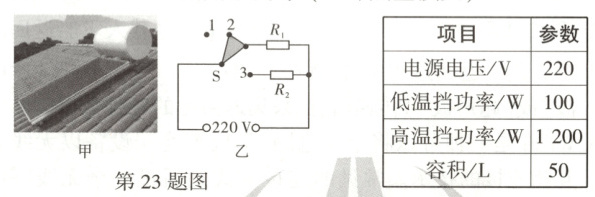 23. 跨科学实践·物理学与社会发展 如图甲所示是一个电辅助太阳能热水器(以下简称热水器);图乙为该热水器电加热部分的原理图,S是控制开关,可以在1、2、3三挡之间切换;如表所示为热水器的铭牌。在光照条件不好时,可用电加热器加热,温度达到预设温度时会自动切换到保温状态,为了防止触电,热水器在向外供水过程中会自动断电。某日因天气原因,太阳辐射能E = 1.75×10⁵ J/(h·m²)(每小时每平方米辐射的热量),太阳能只将水由20℃加热到了30℃,此时开启电加热器,将水加热到预设温度70℃。已知太阳能板的面积为2 m²,水吸收太阳能的效率为60%,水的比热容为4.2×10³ J/(kg·℃),供水过程中不计热量损失。