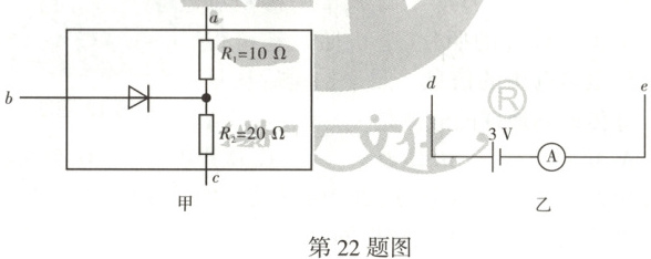 22. 二极管是电子电路的重要元件,它的电路符号为,当电流从它左端流入时,二极管的电阻变为零,可视为二极管短路。当电流从它右端流入时,二极管的电阻为无限大,可视为二极管开路。某学校物理兴趣小组选取了“探索黑箱内的电学元件”作为研究性学习的课题。已知如图甲所示的黑箱中有三个元件,一个二极管、一个10 Ω的电阻,一个20 Ω的电阻,它们连成一个电路,电路在黑箱外有三个接线头a、b、c。图乙是用于测量的外部电路,可通过将d、e与黑箱接线头连接构建通路测电流。求: