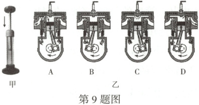 9.B 【解析】图甲中,迅速向下压活塞,是将机械能转化为内能,图乙分别是内燃机工作的四个冲程,其中A是吸气冲程,B是压缩冲程,C是做功冲程,D是排气冲程,只有压缩冲程是将机械能转化为内能,与图甲的能量转化相同。