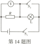 14.D [解析]A.闭合开关$S_{2}$后,小灯泡L被短路,小灯泡L不再发光,故A错误;B、C.开关$S_{2}$断开时,电压表测电阻R两端电压,小于电源电压;闭合开关$S_{2}$后,小灯泡L被短路,只有电阻R接入电路,电压表的示数等于电源电压,示数变大,同时电路中总电阻变小,故B、C错误;D.闭合开关$S_{2}$后,电路总电阻变小,电路总功率$P=\frac{U^{2}}{R_{总}}$变大,故D正确。