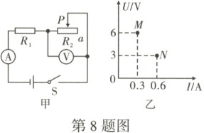 8. _核心素养·科学思维_如图甲所示,电源电压保持不变,闭合开关 $ S $,将滑动变阻器 $ R_{2} $ 的滑片 $ P $ 分别移动到最右端 $ a $ 和某处 $ b $ (图中未标出),记录两次电表的示数并标于图乙中 $ M $、$ N $ 两点处。电源电压为_$ V $。