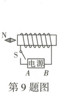 9.负 [解析]由图可知,小磁针的S极靠近螺线管的左端,根据异名磁极相互吸引可知,螺线管的左端为N极。由安培定则可知,电流从电源B端流出,回到A端,所以电源的A端为负极。