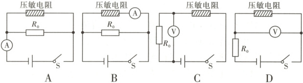 13. 压敏电阻的阻值是随所受压力的增大而减小的。小聪同学想设计一个通过电表的示数反映压敏电阻所受压力大小的电路,要求压力增大时电表的示数增大。下列电路不符合要求的是()