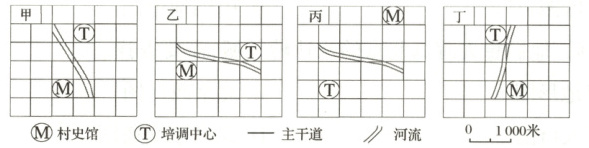 某行政村东西长2千米,南北宽1千米,主干道从南向北通过,河流自东南向西北流过。该村拟修建村史馆和培训中心,分别位于该村西南部和东北部。据此完成7~8题。