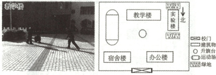 1. 烟台某校地理小组开展了为期一年的实践活动,包括观测校园旗杆影子及其变化、绘制校园平面图等。下图为在教学楼前测量时拍摄的照片及绘制的校园平面图。从校园平面图中能得出的信息有(